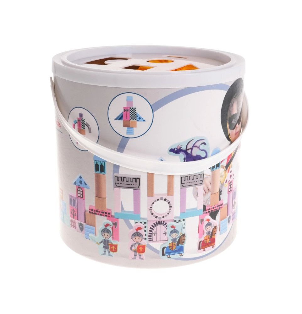 Medinių, dažytų ir vaikams saugių kaladėlių rinkinys, iš kurio vaikai gali pastatyti įspūdingą pilį su riteriais ir net drakonu. Rinkinys skirtas vaikams nuo 3 metų ir puikiai tinka tiek žaidimui, tiek lavinimui.