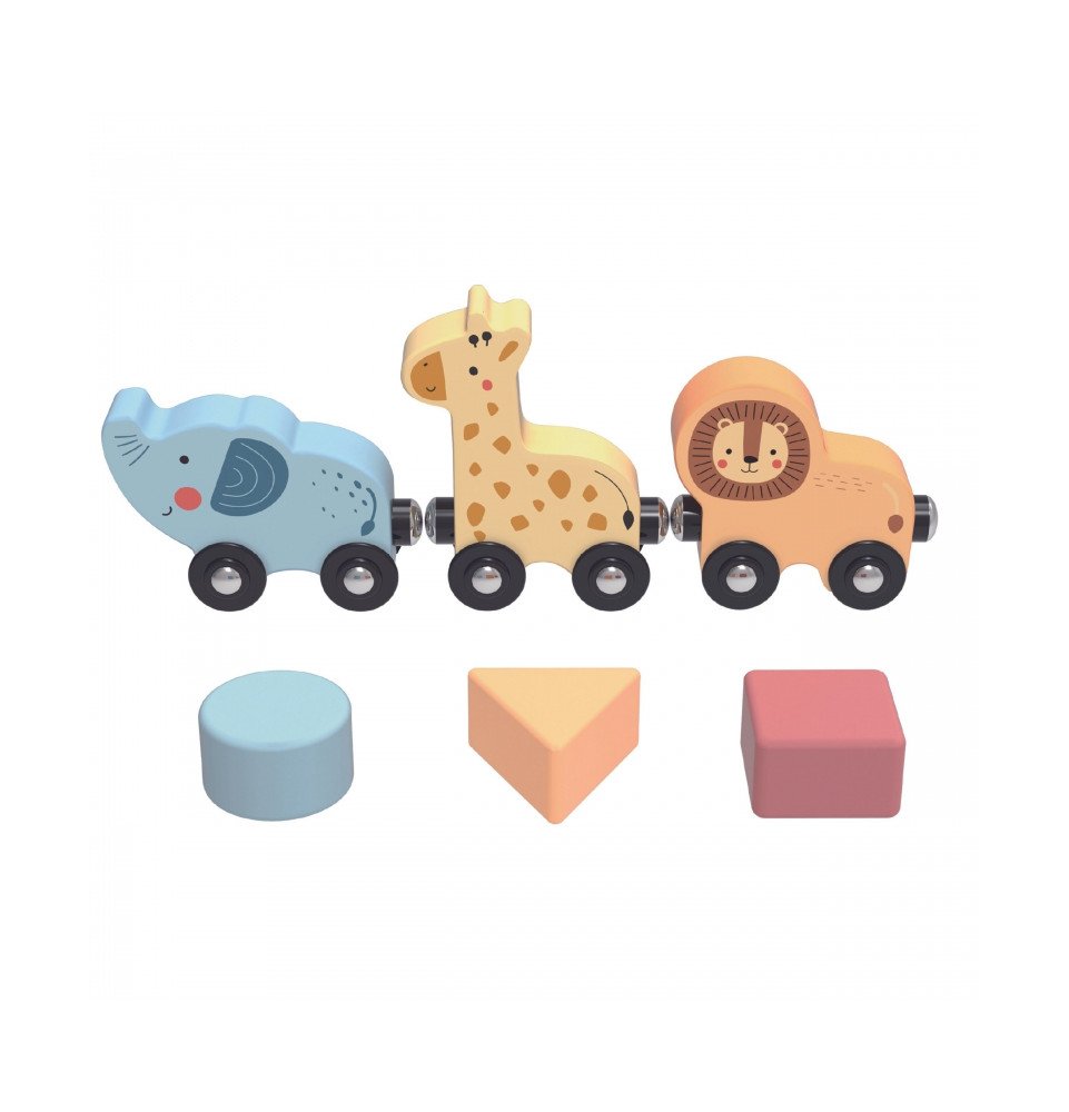 traukinukas juda aplink stalą, o vagonuose – žaismingi gyvūnėliai;