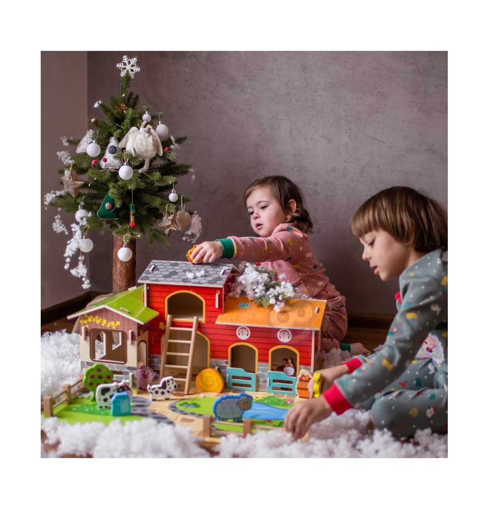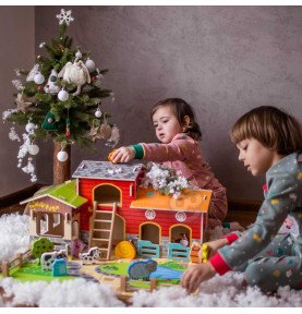 Tai medinis, kruopščiai sukurtas žaislas, leidžiantis vaikams pasinerti į kaimo ūkio kasdienybę. Rinkinyje rasite 18 detalių: gyvūnėlius, pastatus ir tvenkinio zoną – viską, ko reikia tam, kad mažylis galėtų susikurti savo mažąjį ūkį. Čia gyvena arklys, avis, kiaulė, višta, antis ir net šuniukas, kuriuos mažieji gali prižiūrėti ir kurti jiems kasdienes istorijas.